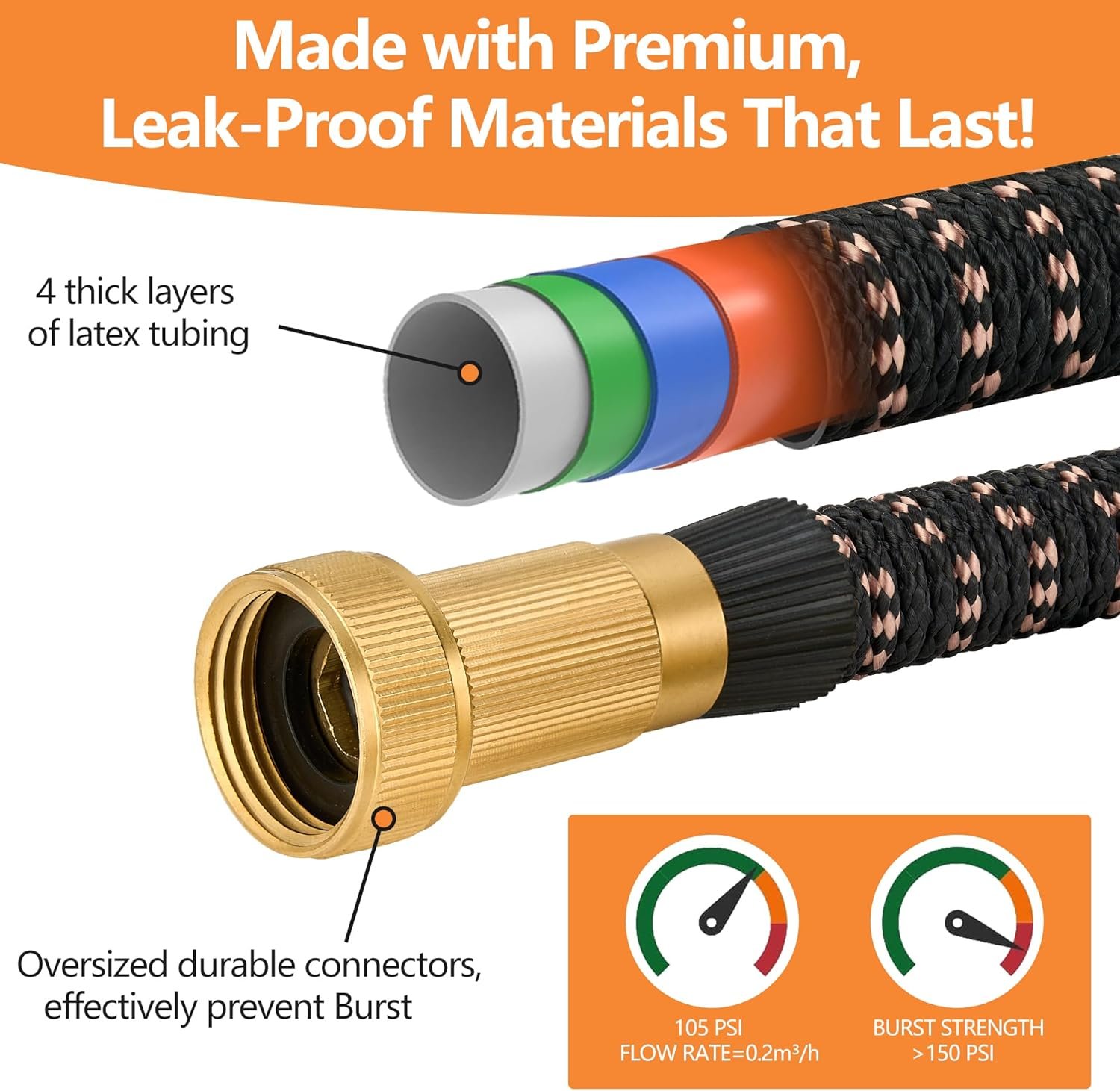 50 ft Expandable Garden Hose – 2025 Upgarded Garden Hose w/10 Pattern Thumb Spray Nozzle, 650psi Pure Brass 3/4” Fittings – Lightweight, Durable, and Kink-Free(Black Rose Gold)