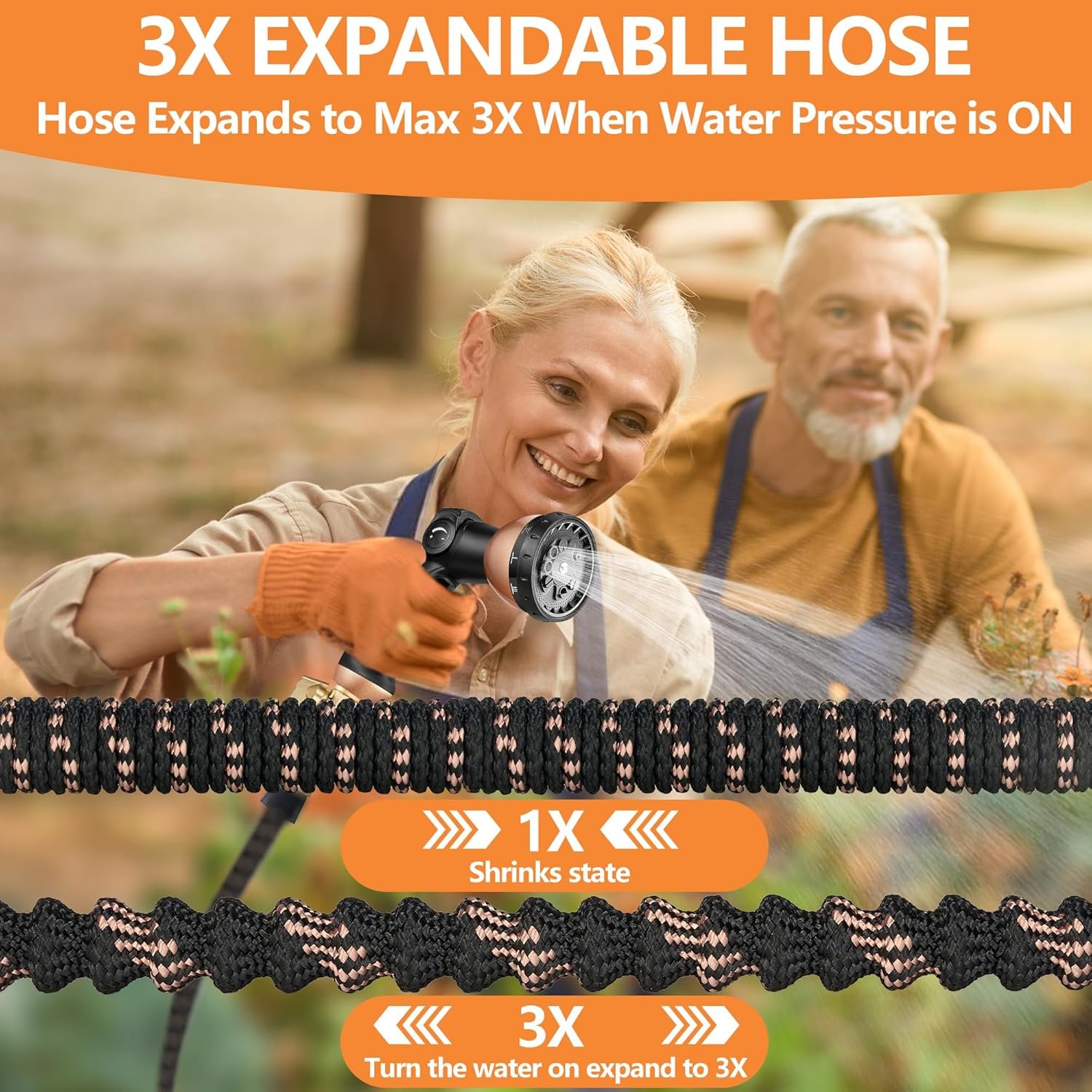 • The Magic of 3X Expandable:Turn on the water, and watch this hose instantly expand to 3x its original length (e.g., from 16.7ft to 50ft)! When the water shuts off, it shrinks back to its compact original size in minutes. No more wrestling with bulky, tangled hoses—perfect for easy storage in your garage, shed, or even a closet.